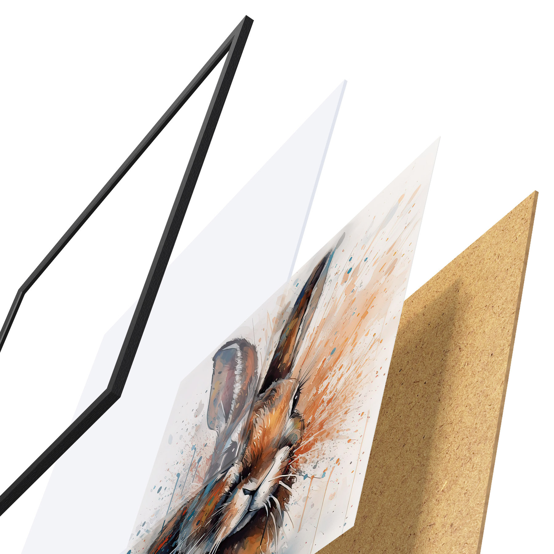 Das Poster besteht aus einem Rahmen, Plexiglas, einem gedruckten Bild und einer Rückwand aus Spanplatten. Dank der Halterungen auf der Rückseite kann das Poster sofort an die Wand gehängt werden.