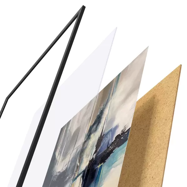 Das Poster besteht aus einem Rahmen, Plexiglas, einem gedruckten Bild und einer Rückwand aus Spanplatten. Dank der Halterungen auf der Rückseite kann das Poster sofort an die Wand gehängt werden.
