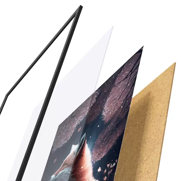 Das Poster besteht aus einem Rahmen, Plexiglas, einem gedruckten Bild und einer Rückwand aus Spanplatten. Dank der Halterungen auf der Rückseite kann das Poster sofort an die Wand gehängt werden.