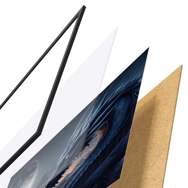 Das Poster besteht aus einem Rahmen, Plexiglas, einem gedruckten Bild und einer Rückwand aus Spanplatten. Dank der Halterungen auf der Rückseite kann das Poster sofort an die Wand gehängt werden.