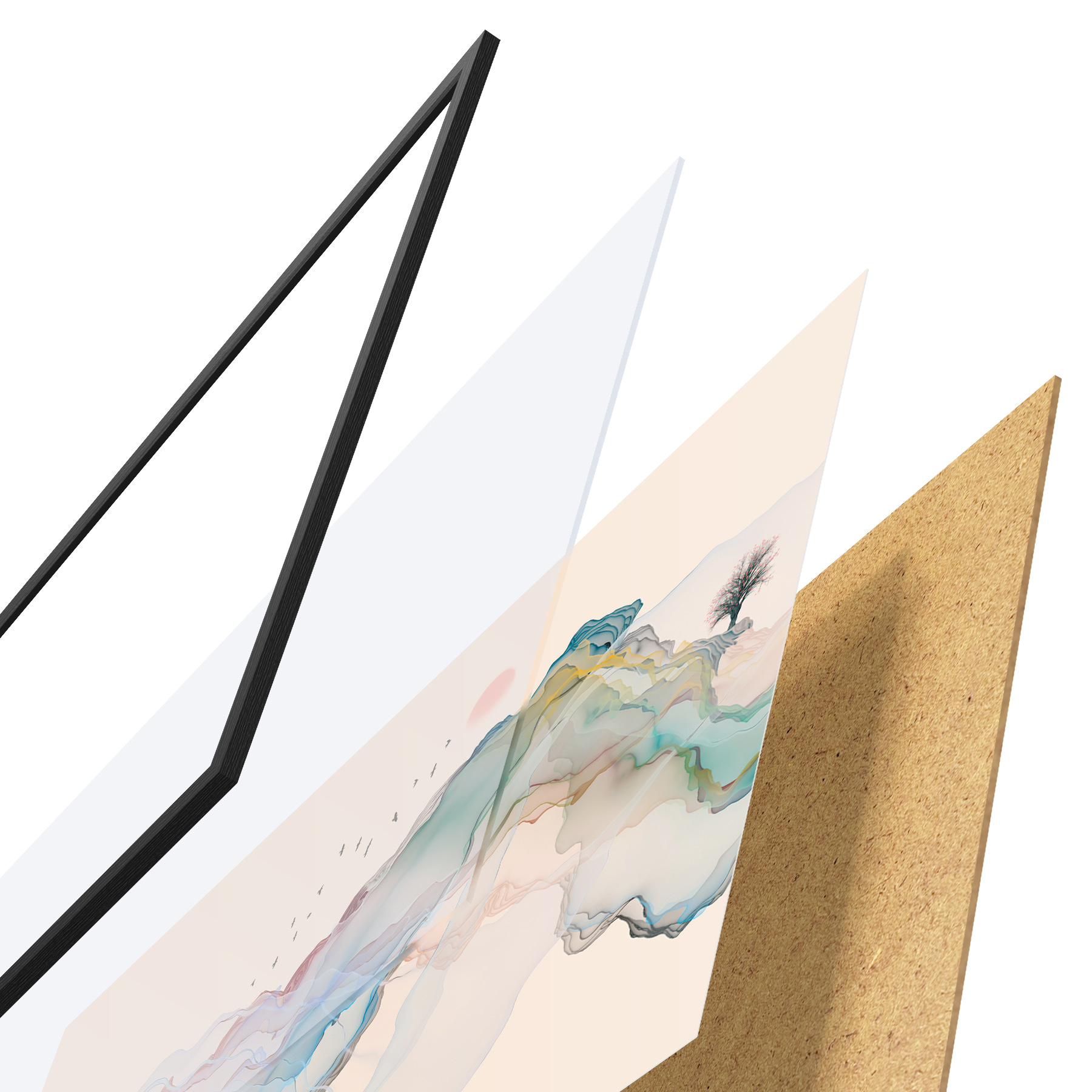 Das Poster besteht aus einem Rahmen, Plexiglas, einem gedruckten Bild und einer Rückwand aus Spanplatten. Dank der Halterungen auf der Rückseite kann das Poster sofort an die Wand gehängt werden.