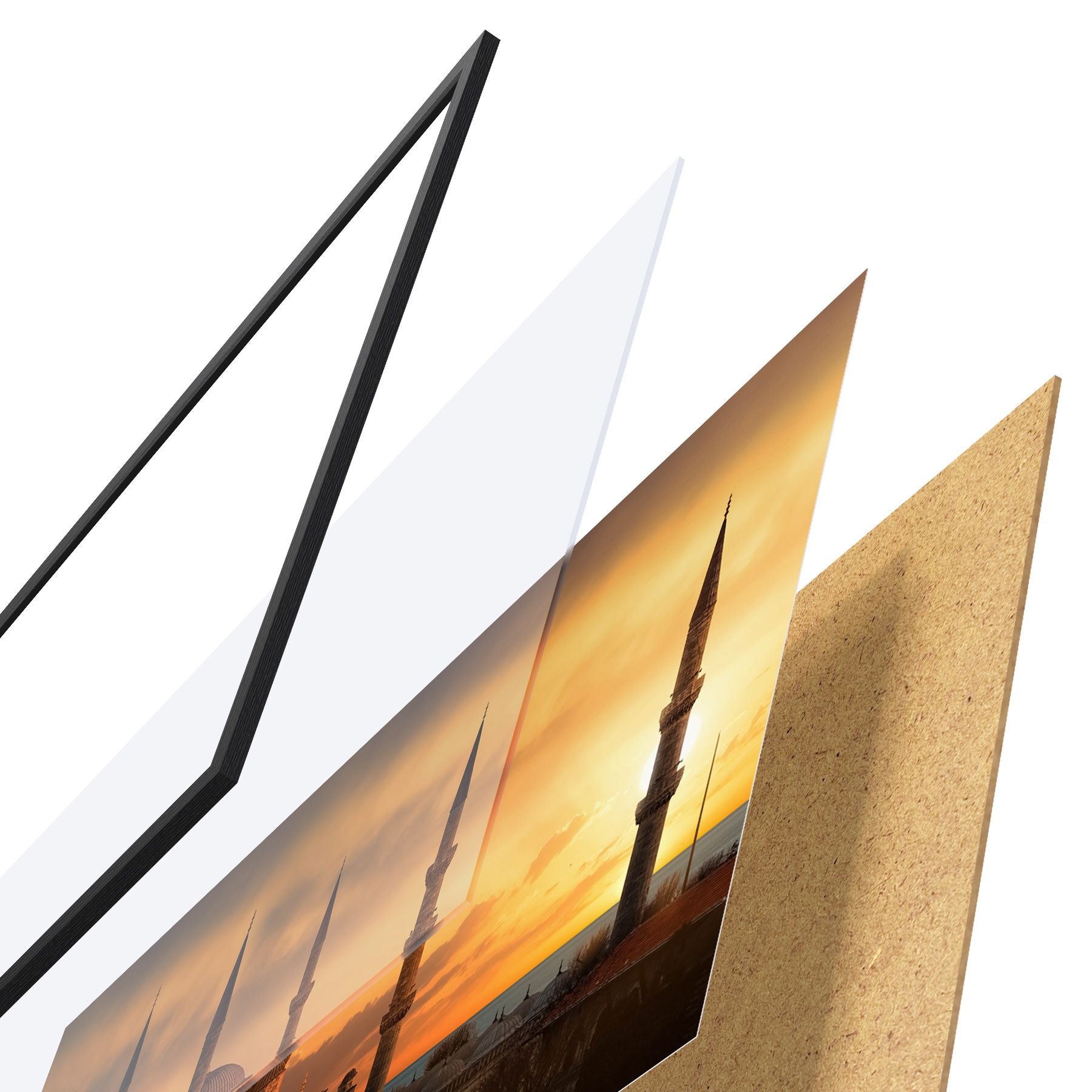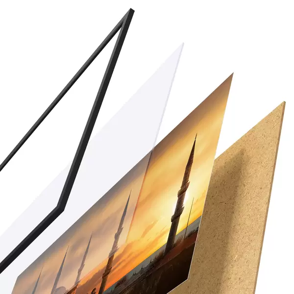 Das Poster besteht aus einem Rahmen, Plexiglas, einem gedruckten Bild und einer Rückwand aus Spanplatten. Dank der Halterungen auf der Rückseite kann das Poster sofort an die Wand gehängt werden.