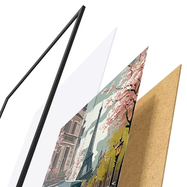 Das Poster besteht aus einem Rahmen, Plexiglas, einem gedruckten Bild und einer Rückwand aus Spanplatten. Dank der Halterungen auf der Rückseite kann das Poster sofort an die Wand gehängt werden.