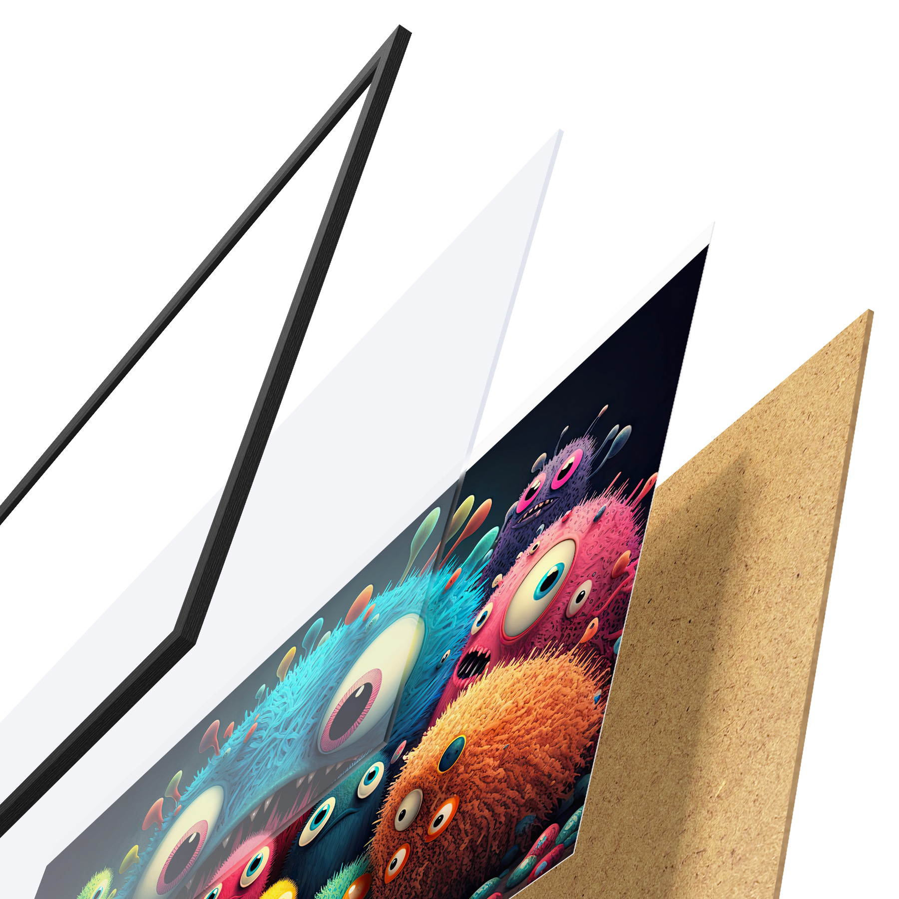 Das Poster besteht aus einem Rahmen, Plexiglas, einem gedruckten Bild und einer Rückwand aus Spanplatten. Dank der Halterungen auf der Rückseite kann das Poster sofort an die Wand gehängt werden.