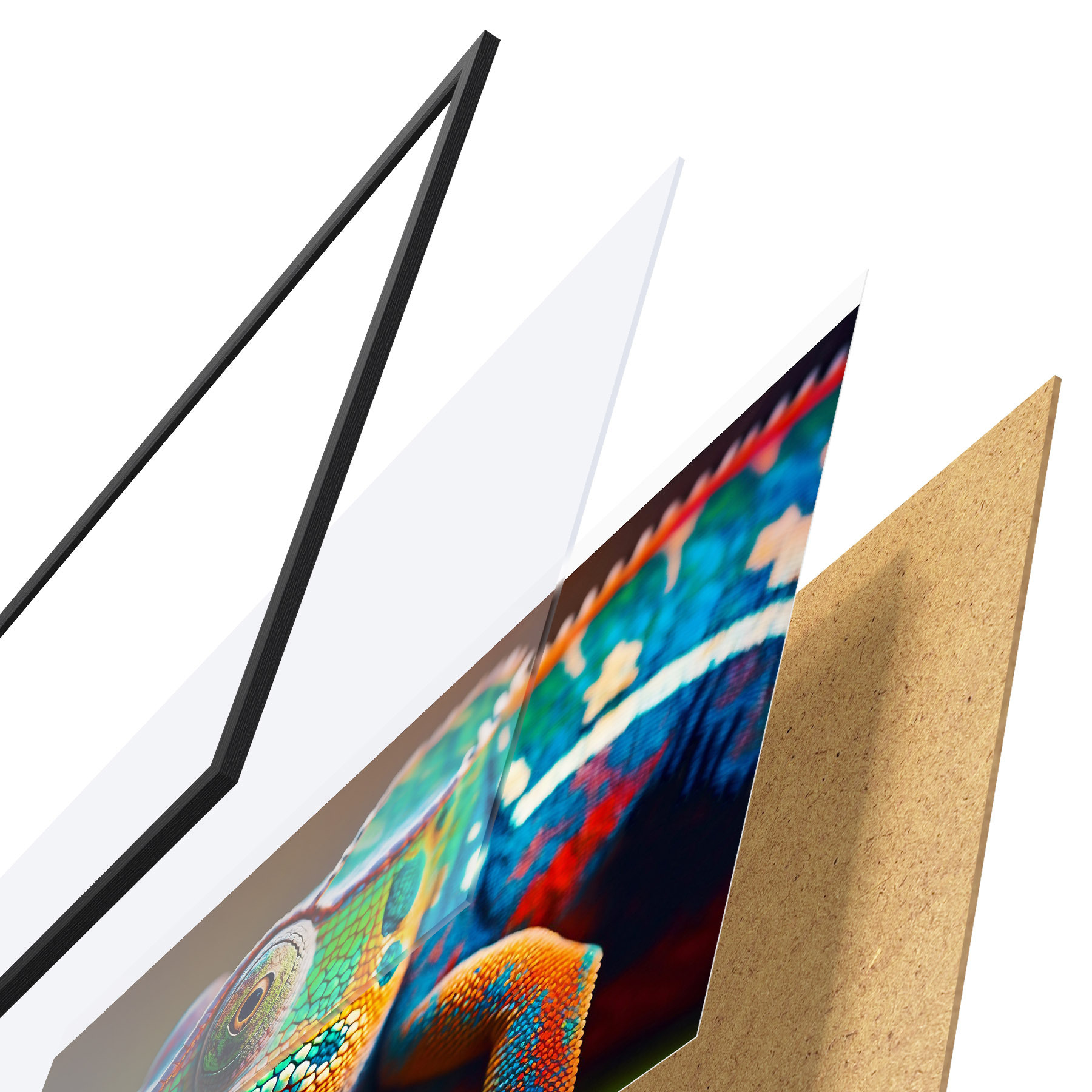 Das Poster besteht aus einem Rahmen, Plexiglas, einem gedruckten Bild und einer Rückwand aus Spanplatten. Dank der Halterungen auf der Rückseite kann das Poster sofort an die Wand gehängt werden.
