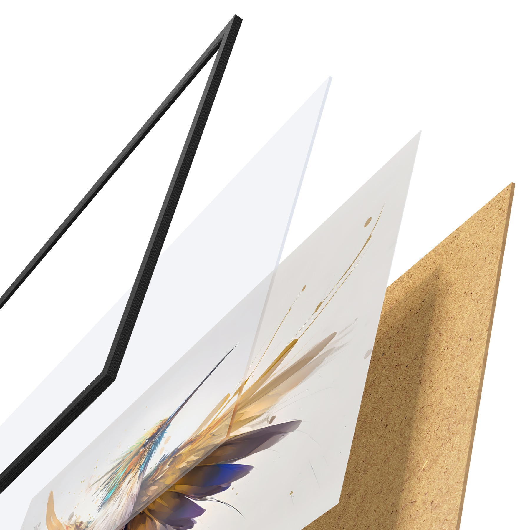 Das Poster besteht aus einem Rahmen, Plexiglas, einem gedruckten Bild und einer Rückwand aus Spanplatten. Dank der Halterungen auf der Rückseite kann das Poster sofort an die Wand gehängt werden.