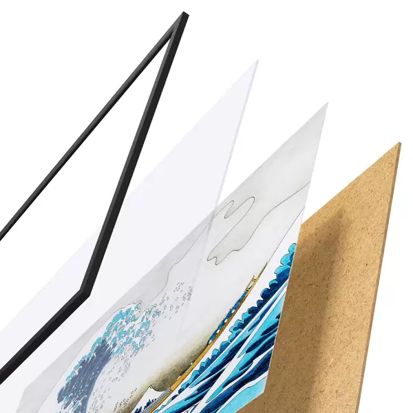 Das Poster besteht aus einem Rahmen, Plexiglas, einem gedruckten Bild und einer Rückwand aus Spanplatten. Dank der Halterungen auf der Rückseite kann das Poster sofort an die Wand gehängt werden.