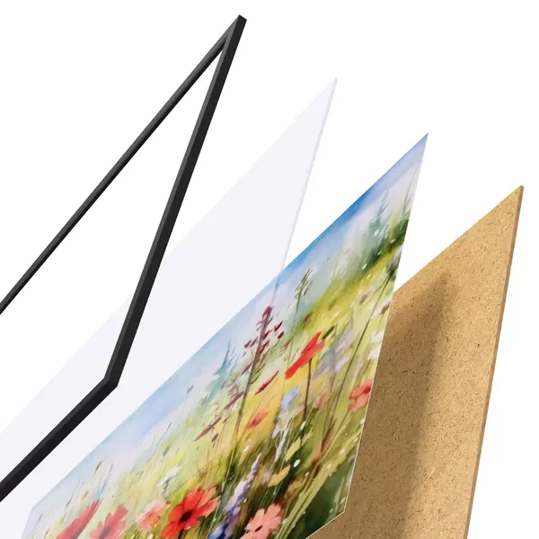 Das Poster besteht aus einem Rahmen, Plexiglas, einem gedruckten Bild und einer Rückwand aus Spanplatten. Dank der Halterungen auf der Rückseite kann das Poster sofort an die Wand gehängt werden.