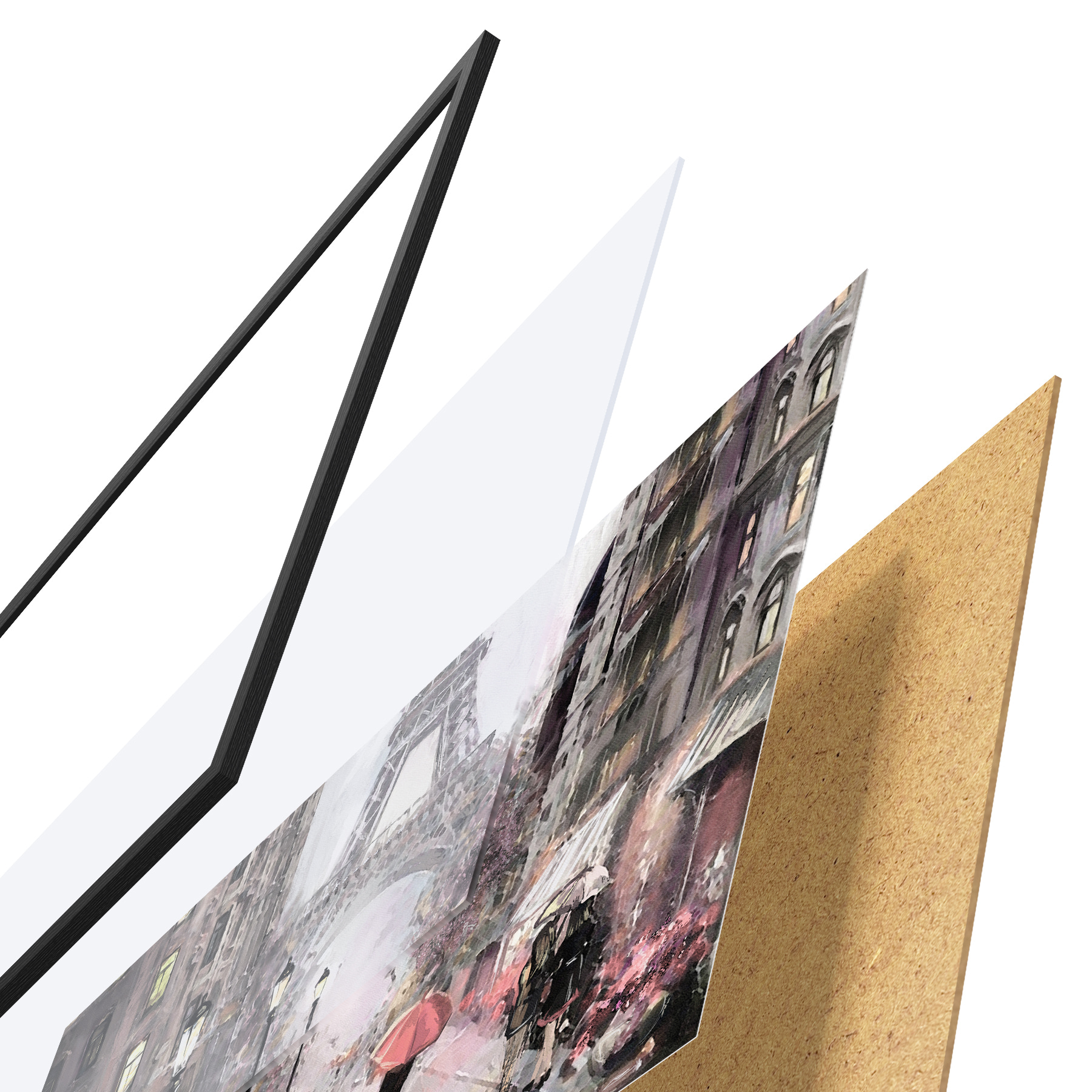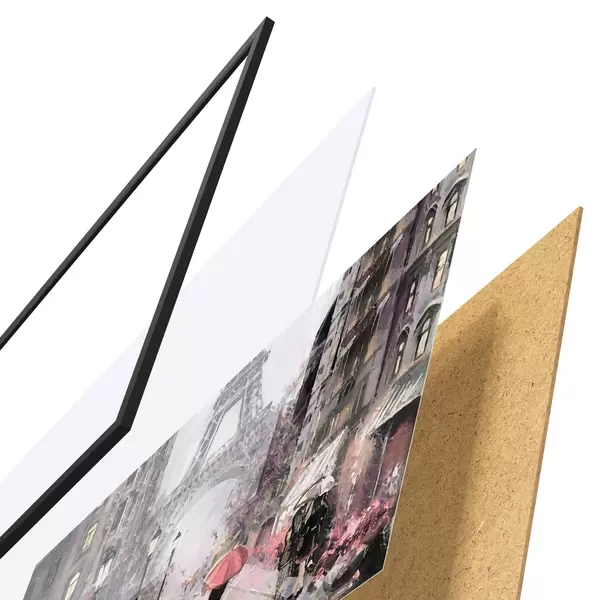 Das Poster besteht aus einem Rahmen, Plexiglas, einem gedruckten Bild und einer Rückwand aus Spanplatten. Dank der Halterungen auf der Rückseite kann das Poster sofort an die Wand gehängt werden.