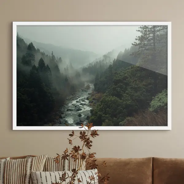 Poster Nebelverhangener Wald am fließenden Fluss f33760