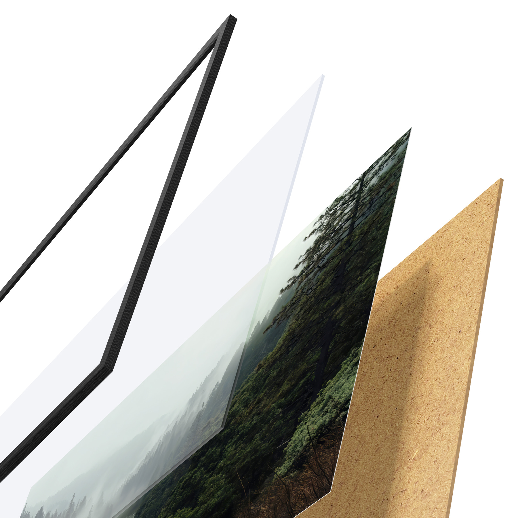 Das Poster besteht aus einem Rahmen, Plexiglas, einem gedruckten Bild und einer Rückwand aus Spanplatten. Dank der Halterungen auf der Rückseite kann das Poster sofort an die Wand gehängt werden.