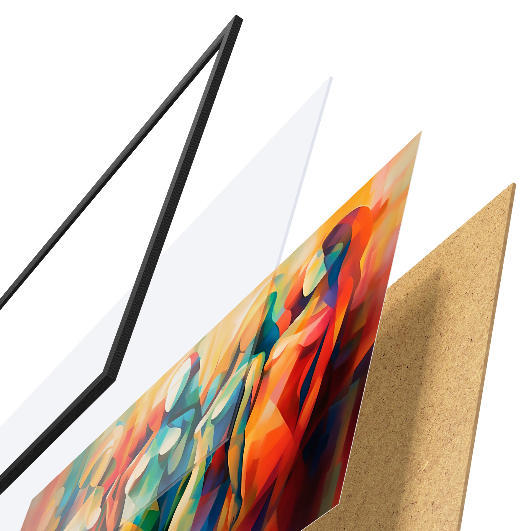 Das Poster besteht aus einem Rahmen, Plexiglas, einem gedruckten Bild und einer Rückwand aus Spanplatten. Dank der Halterungen auf der Rückseite kann das Poster sofort an die Wand gehängt werden.
