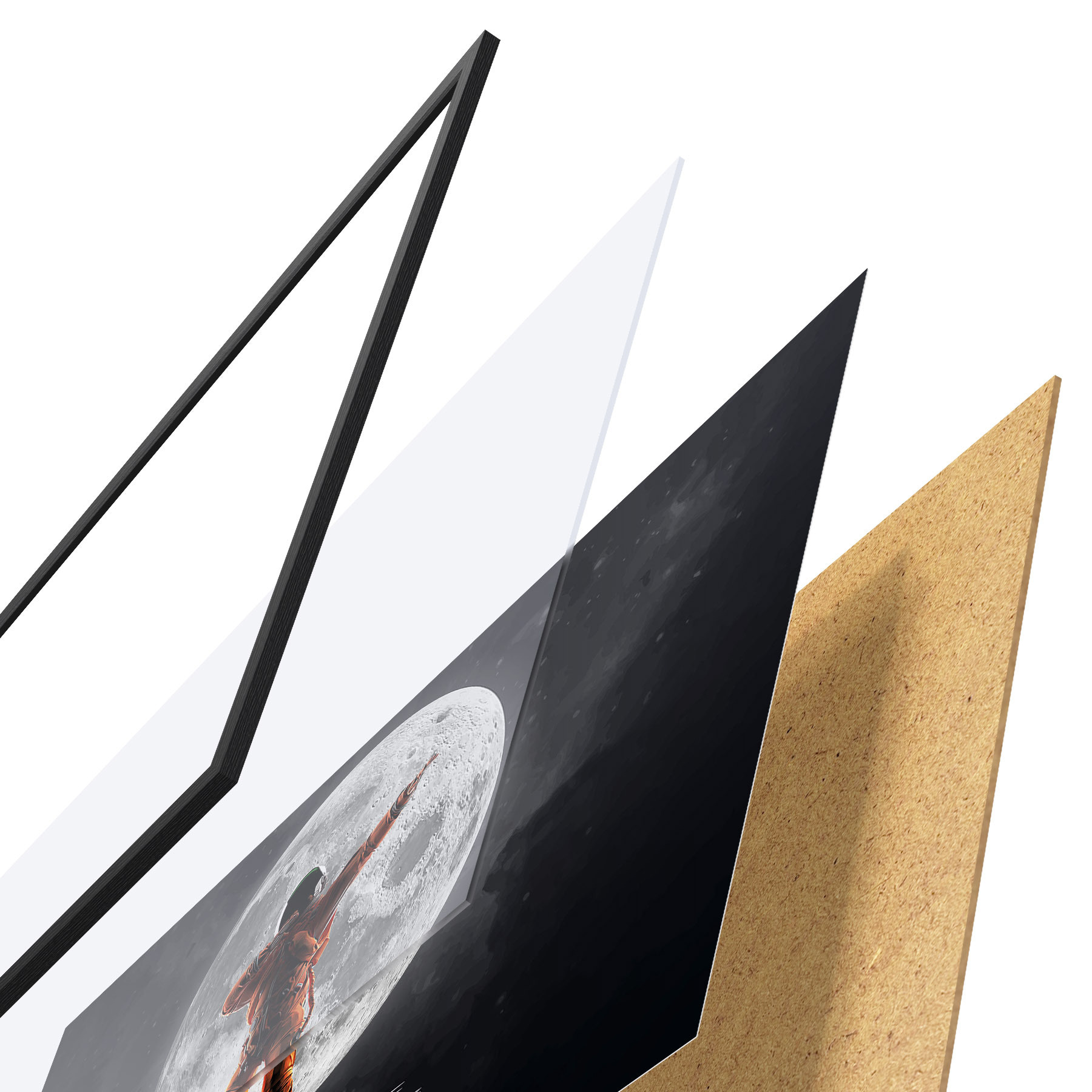 Das Poster besteht aus einem Rahmen, Plexiglas, einem gedruckten Bild und einer Rückwand aus Spanplatten. Dank der Halterungen auf der Rückseite kann das Poster sofort an die Wand gehängt werden.