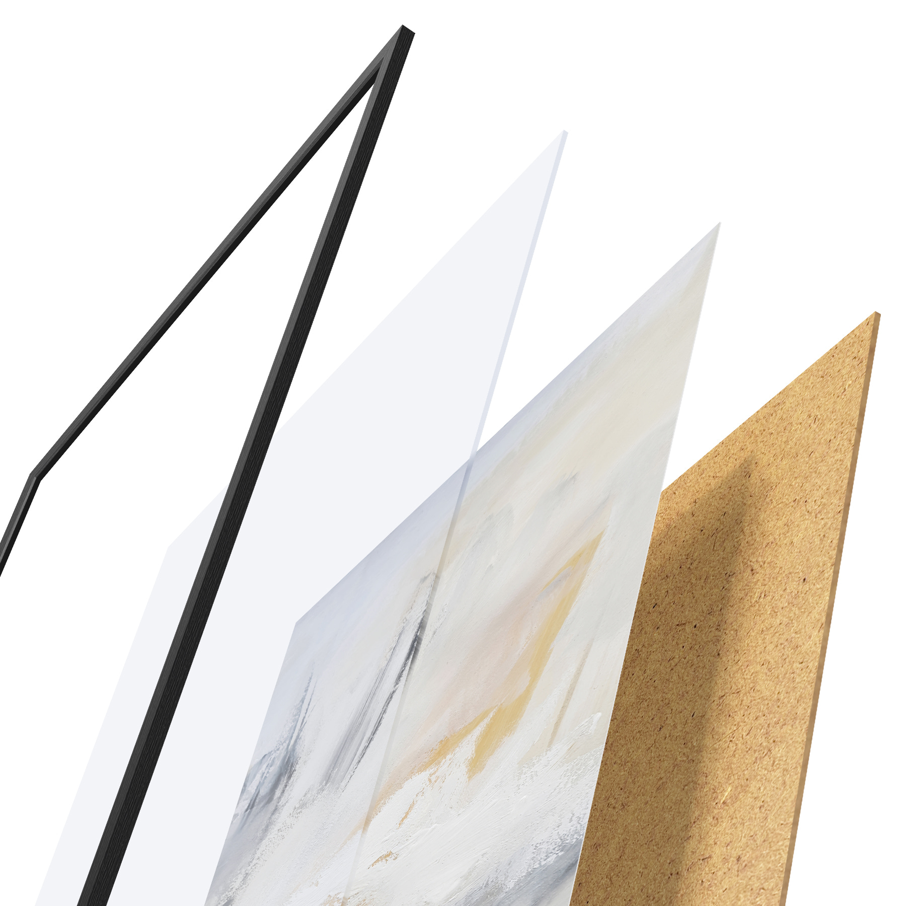 Das Poster besteht aus einem Rahmen, Plexiglas, einem gedruckten Bild und einer Rückwand aus Spanplatten. Dank der Halterungen auf der Rückseite kann das Poster sofort an die Wand gehängt werden.