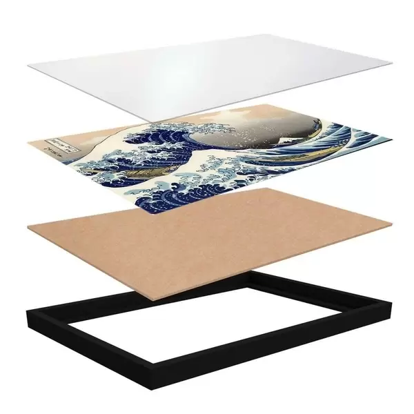 Das Poster besteht aus einem Rahmen, Plexiglas, einem gedruckten Bild und einer Rückwand aus Spanplatten. Dank der Halterungen auf der Rückseite kann das Poster sofort an die Wand gehängt werden.