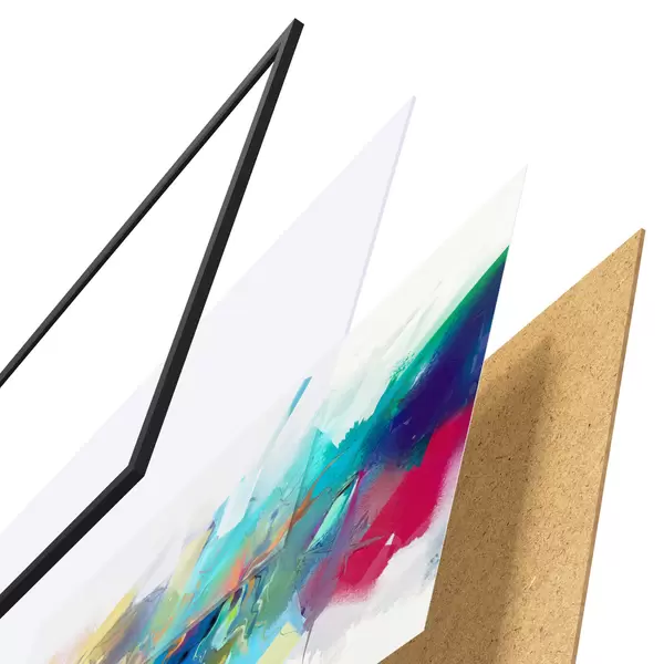 Das Poster besteht aus einem Rahmen, Plexiglas, einem gedruckten Bild und einer Rückwand aus Spanplatten. Dank der Halterungen auf der Rückseite kann das Poster sofort an die Wand gehängt werden.