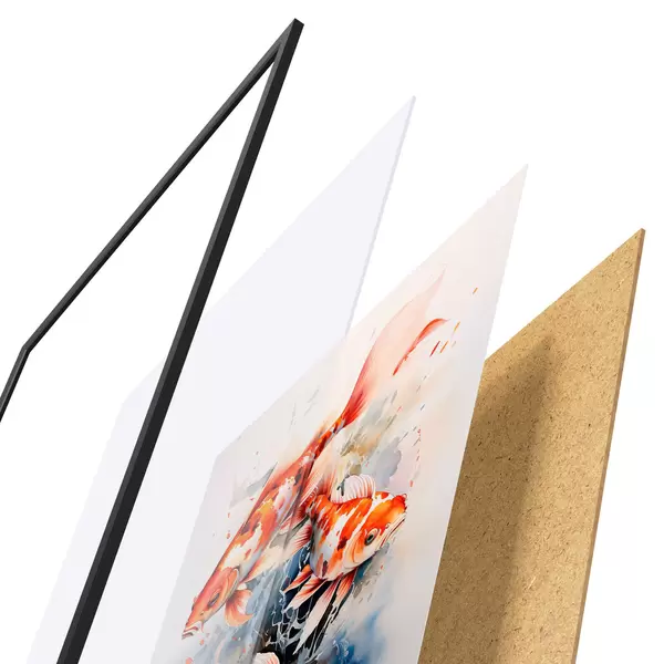 Das Poster besteht aus einem Rahmen, Plexiglas, einem gedruckten Bild und einer Rückwand aus Spanplatten. Dank der Halterungen auf der Rückseite kann das Poster sofort an die Wand gehängt werden.