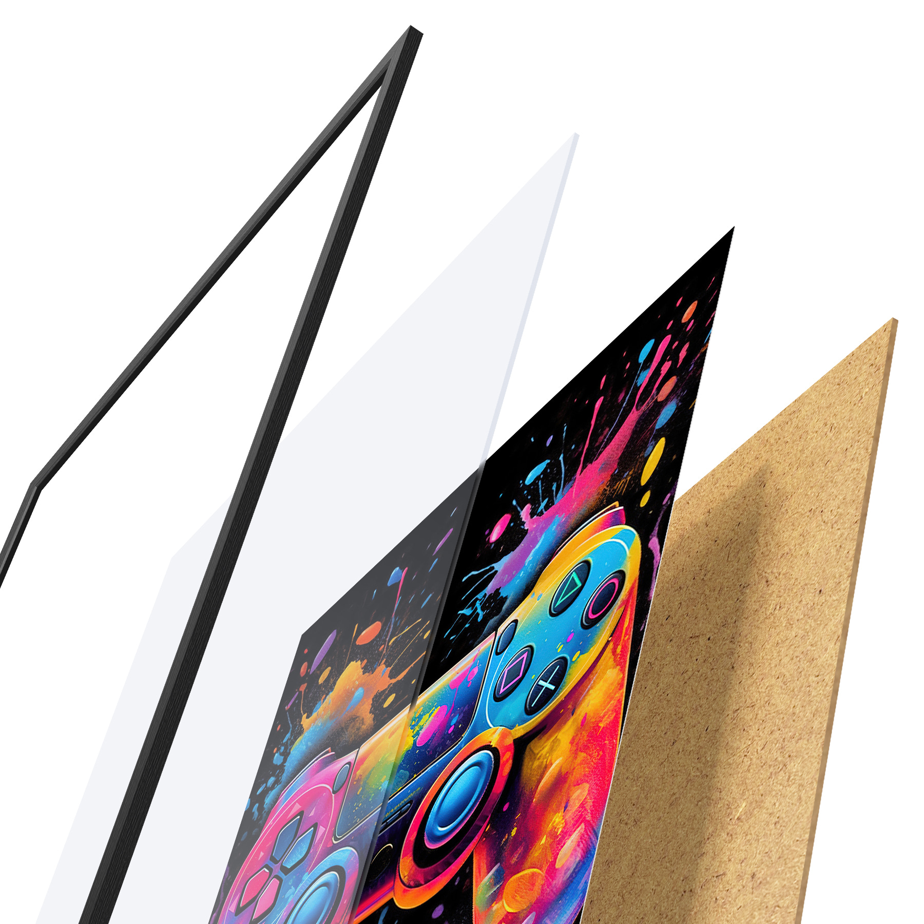 Das Poster besteht aus einem Rahmen, Plexiglas, einem gedruckten Bild und einer Rückwand aus Spanplatten. Dank der Halterungen auf der Rückseite kann das Poster sofort an die Wand gehängt werden.