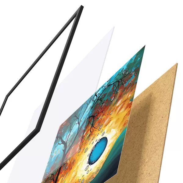 Das Poster besteht aus einem Rahmen, Plexiglas, einem gedruckten Bild und einer Rückwand aus Spanplatten. Dank der Halterungen auf der Rückseite kann das Poster sofort an die Wand gehängt werden.
