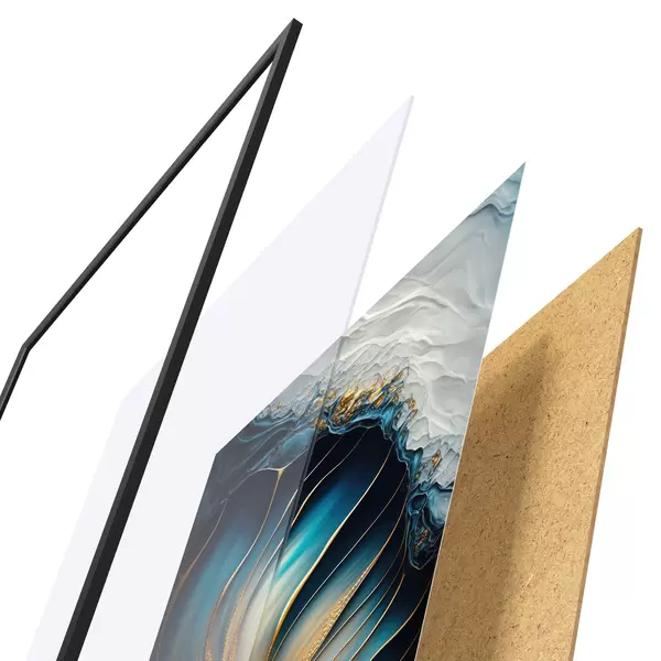 Das Poster besteht aus einem Rahmen, Plexiglas, einem gedruckten Bild und einer Rückwand aus Spanplatten. Dank der Halterungen auf der Rückseite kann das Poster sofort an die Wand gehängt werden.