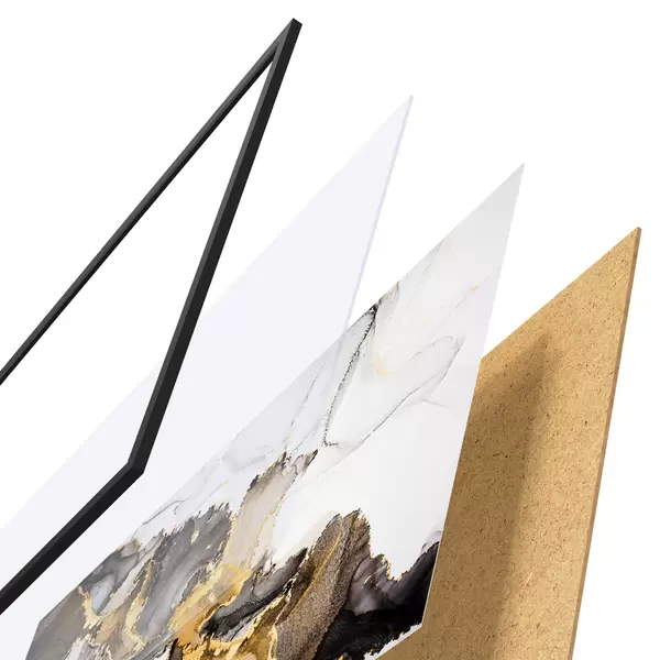 Das Poster besteht aus einem Rahmen, Plexiglas, einem gedruckten Bild und einer Rückwand aus Spanplatten. Dank der Halterungen auf der Rückseite kann das Poster sofort an die Wand gehängt werden.