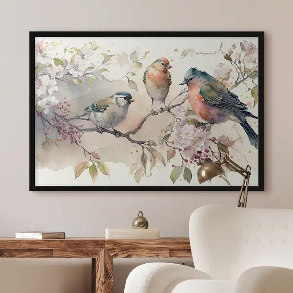 Poster Bunte Vögel sitzen zwischen Blüten f34490