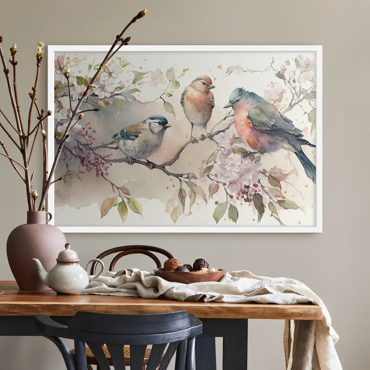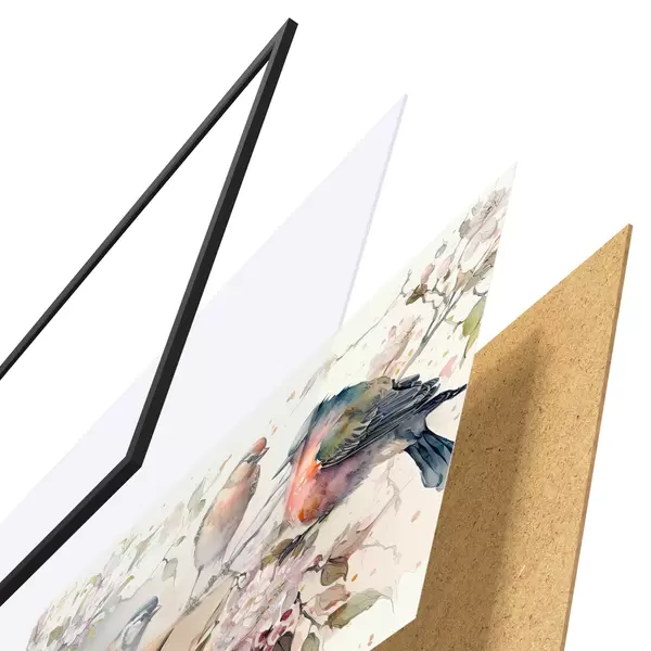 Poster Bunte Vögel sitzen zwischen Blüten Nr f34490