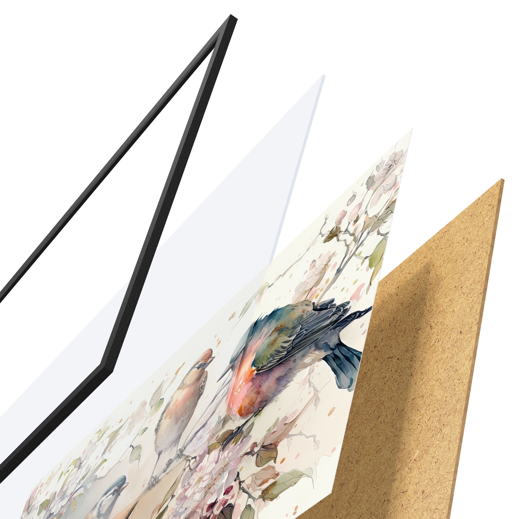 Das Poster besteht aus einem Rahmen, Plexiglas, einem gedruckten Bild und einer Rückwand aus Spanplatten. Dank der Halterungen auf der Rückseite kann das Poster sofort an die Wand gehängt werden.