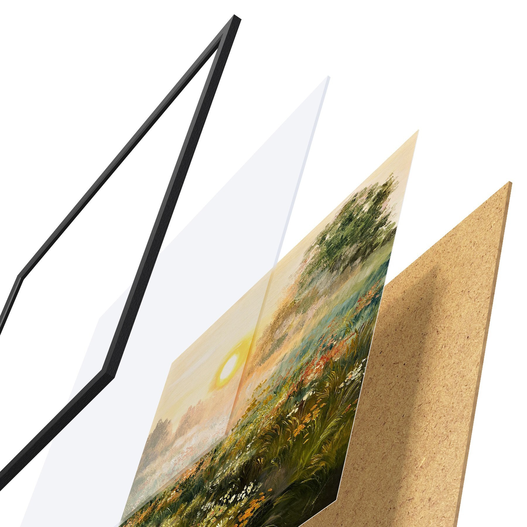 Das Poster besteht aus einem Rahmen, Plexiglas, einem gedruckten Bild und einer Rückwand aus Spanplatten. Dank der Halterungen auf der Rückseite kann das Poster sofort an die Wand gehängt werden.