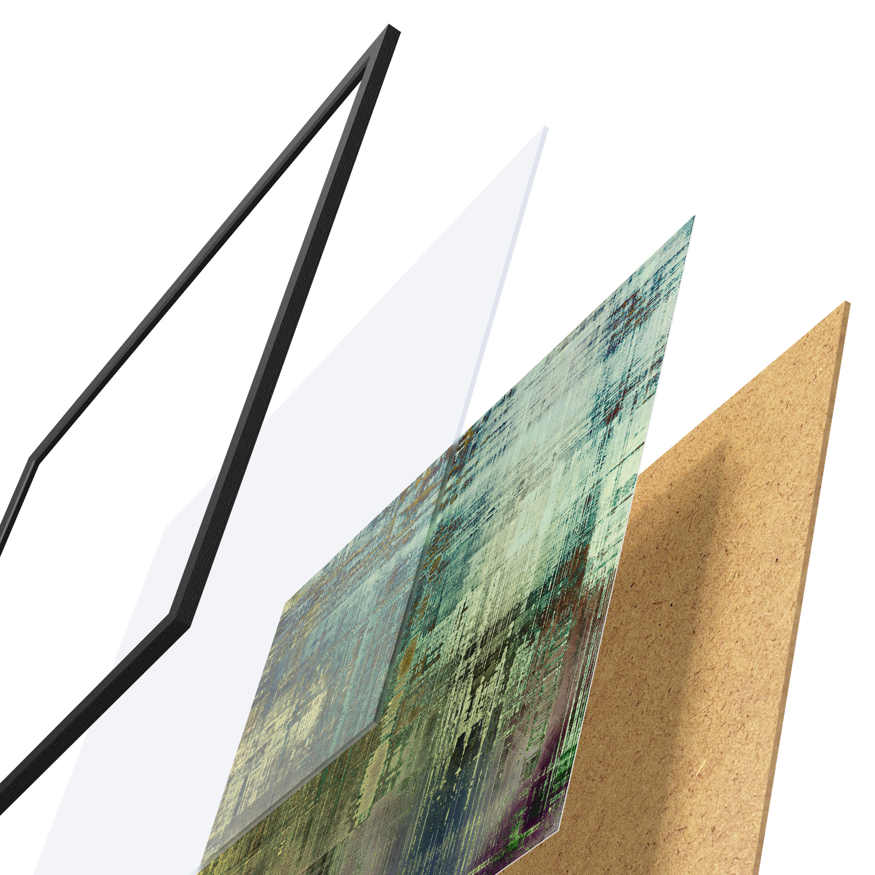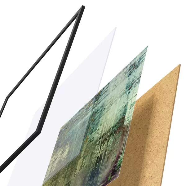 Das Poster besteht aus einem Rahmen, Plexiglas, einem gedruckten Bild und einer Rückwand aus Spanplatten. Dank der Halterungen auf der Rückseite kann das Poster sofort an die Wand gehängt werden.