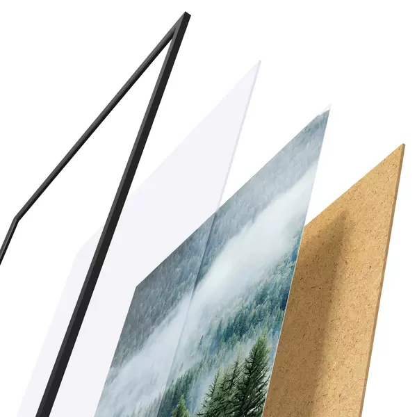 Das Poster besteht aus einem Rahmen, Plexiglas, einem gedruckten Bild und einer Rückwand aus Spanplatten. Dank der Halterungen auf der Rückseite kann das Poster sofort an die Wand gehängt werden.