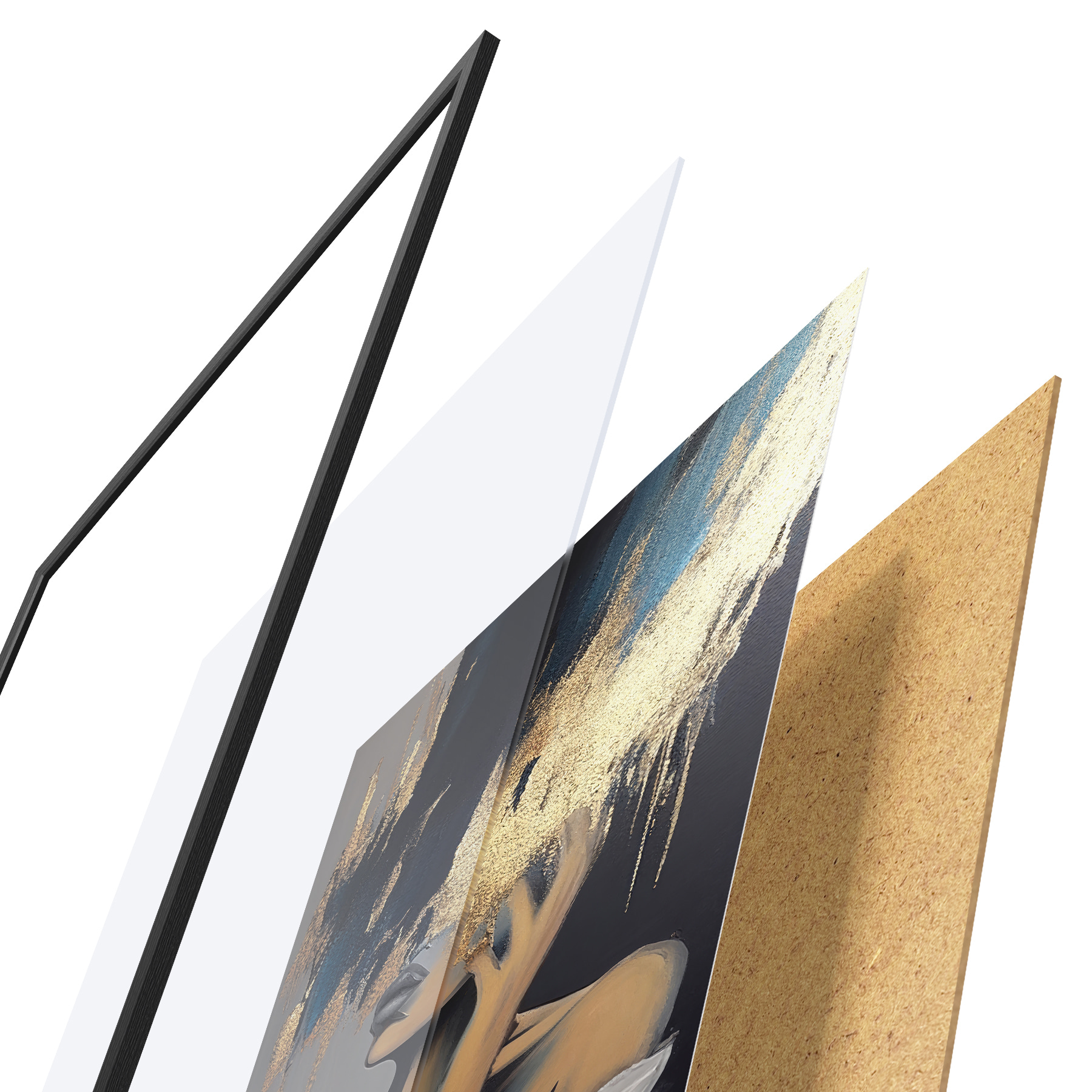 Das Poster besteht aus einem Rahmen, Plexiglas, einem gedruckten Bild und einer Rückwand aus Spanplatten. Dank der Halterungen auf der Rückseite kann das Poster sofort an die Wand gehängt werden.