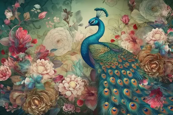 Poster Strahlender Pfau inmitten blühender Blumen Nr f34869