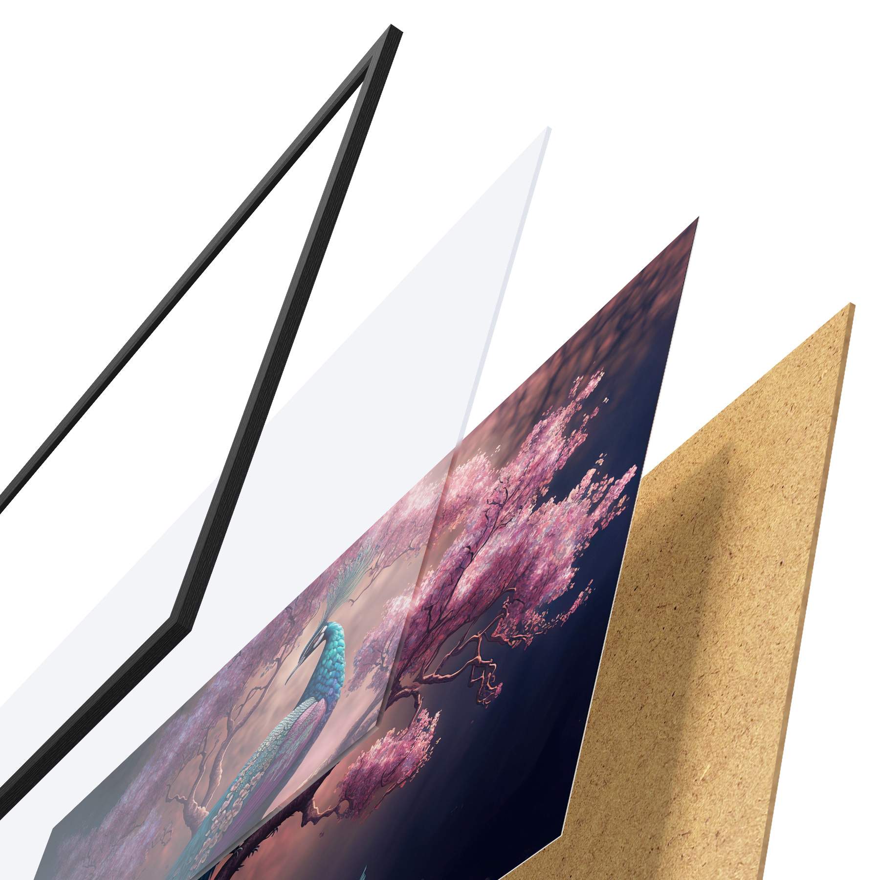 Das Poster besteht aus einem Rahmen, Plexiglas, einem gedruckten Bild und einer Rückwand aus Spanplatten. Dank der Halterungen auf der Rückseite kann das Poster sofort an die Wand gehängt werden.