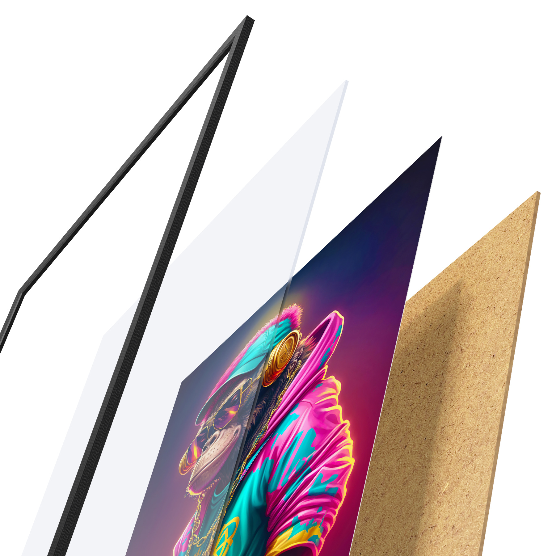 Das Poster besteht aus einem Rahmen, Plexiglas, einem gedruckten Bild und einer Rückwand aus Spanplatten. Dank der Halterungen auf der Rückseite kann das Poster sofort an die Wand gehängt werden.