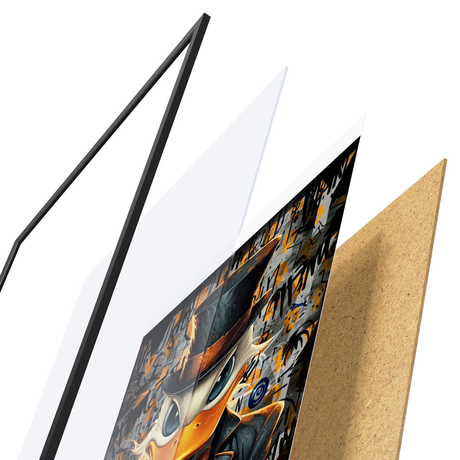 Das Poster besteht aus einem Rahmen, Plexiglas, einem gedruckten Bild und einer Rückwand aus Spanplatten. Dank der Halterungen auf der Rückseite kann das Poster sofort an die Wand gehängt werden.