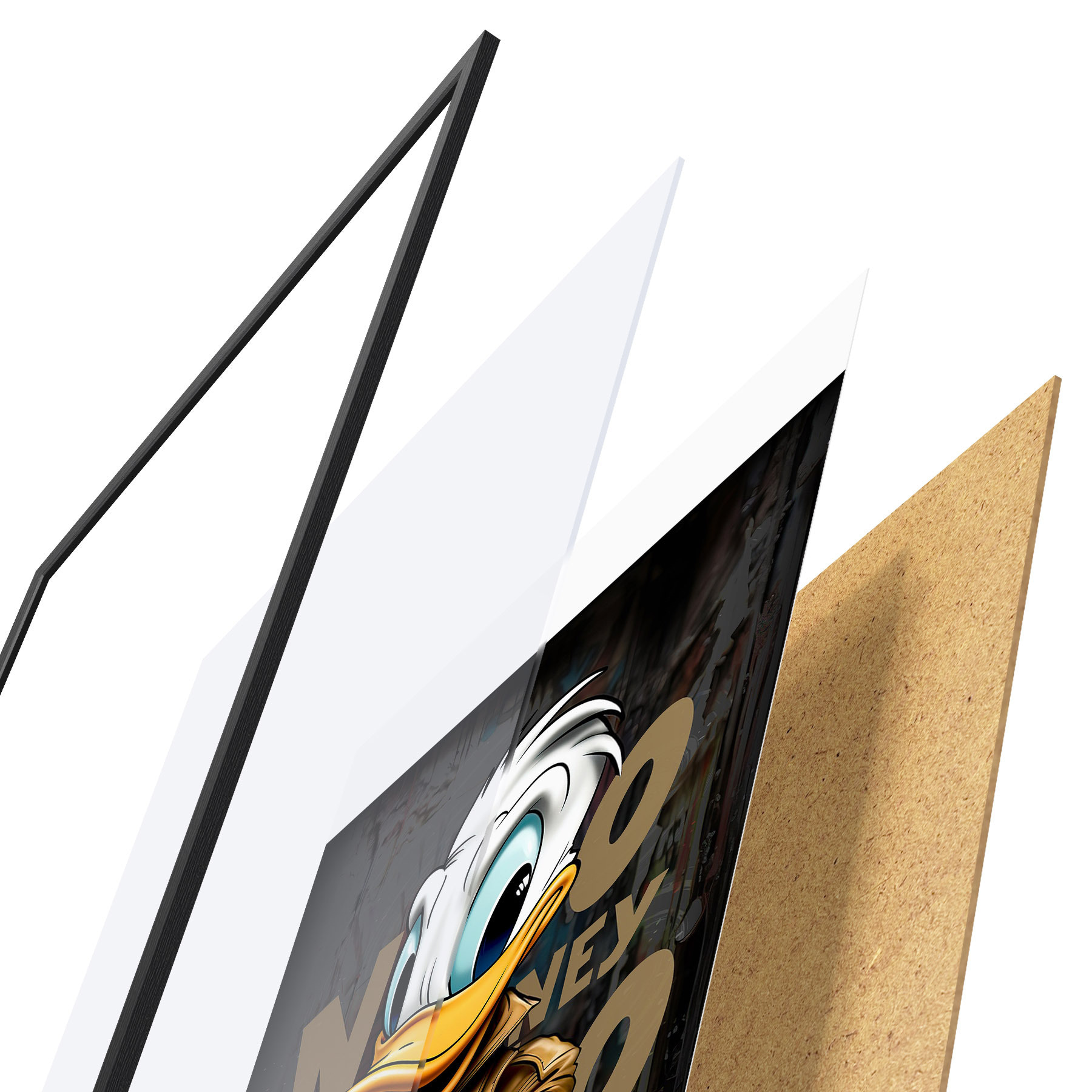 Das Poster besteht aus einem Rahmen, Plexiglas, einem gedruckten Bild und einer Rückwand aus Spanplatten. Dank der Halterungen auf der Rückseite kann das Poster sofort an die Wand gehängt werden.