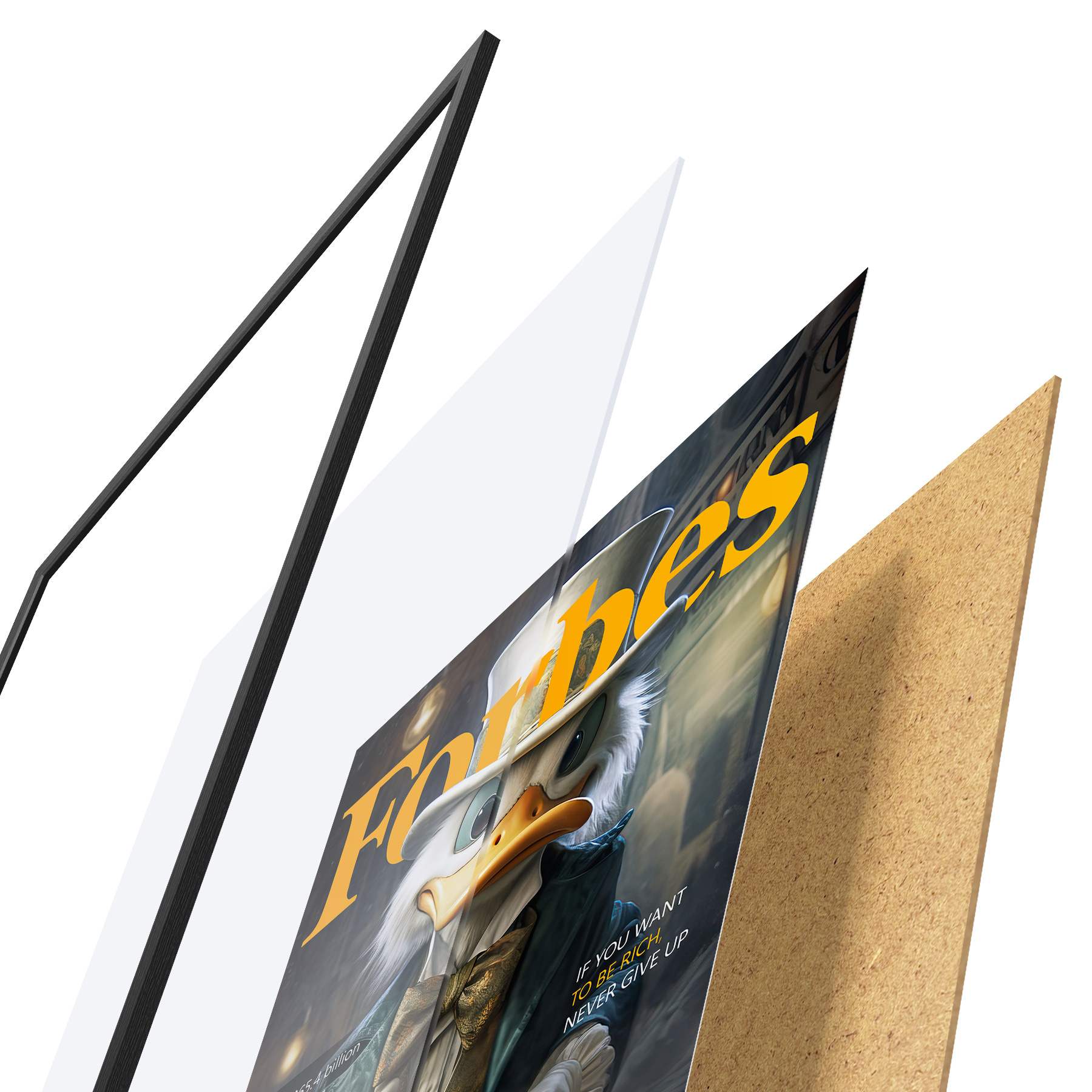 Das Poster besteht aus einem Rahmen, Plexiglas, einem gedruckten Bild und einer Rückwand aus Spanplatten. Dank der Halterungen auf der Rückseite kann das Poster sofort an die Wand gehängt werden.