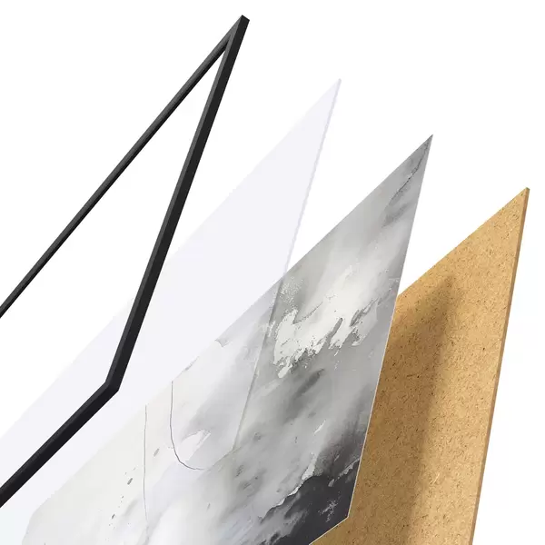 Das Poster besteht aus einem Rahmen, Plexiglas, einem gedruckten Bild und einer Rückwand aus Spanplatten. Dank der Halterungen auf der Rückseite kann das Poster sofort an die Wand gehängt werden.
