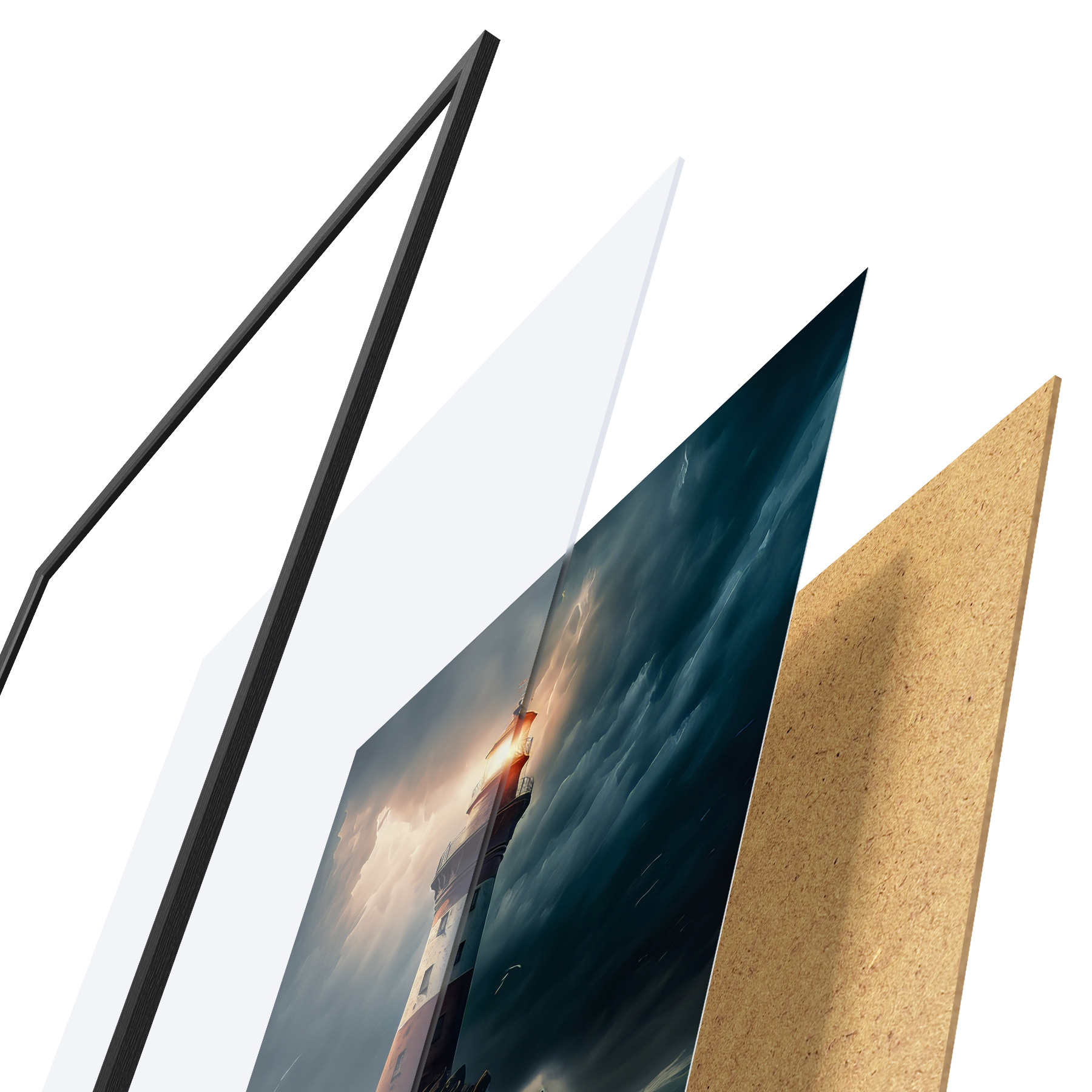 Das Poster besteht aus einem Rahmen, Plexiglas, einem gedruckten Bild und einer Rückwand aus Spanplatten. Dank der Halterungen auf der Rückseite kann das Poster sofort an die Wand gehängt werden.