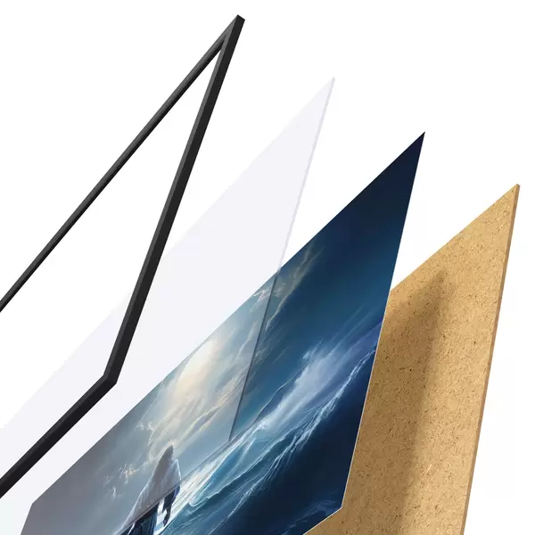 Das Poster besteht aus einem Rahmen, Plexiglas, einem gedruckten Bild und einer Rückwand aus Spanplatten. Dank der Halterungen auf der Rückseite kann das Poster sofort an die Wand gehängt werden.