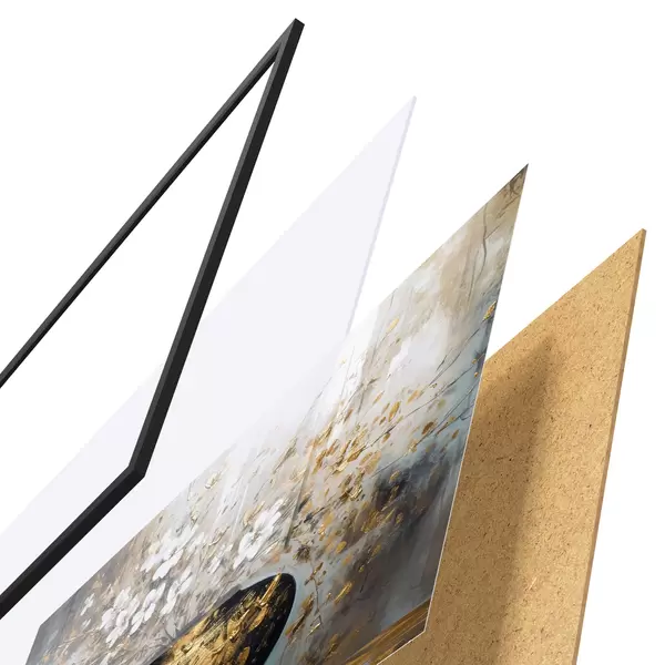Das Poster besteht aus einem Rahmen, Plexiglas, einem gedruckten Bild und einer Rückwand aus Spanplatten. Dank der Halterungen auf der Rückseite kann das Poster sofort an die Wand gehängt werden.