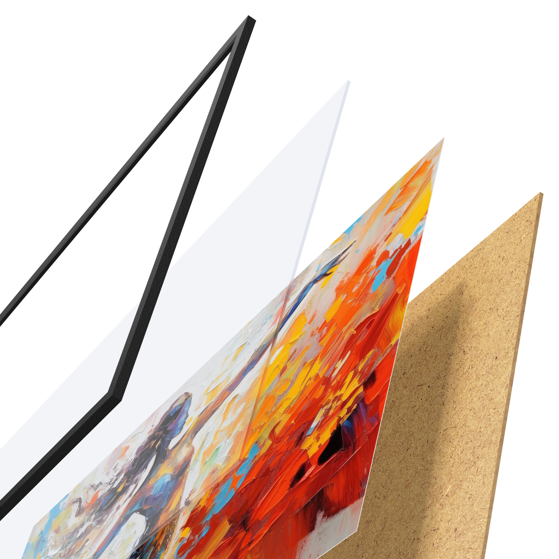 Das Poster besteht aus einem Rahmen, Plexiglas, einem gedruckten Bild und einer Rückwand aus Spanplatten. Dank der Halterungen auf der Rückseite kann das Poster sofort an die Wand gehängt werden.