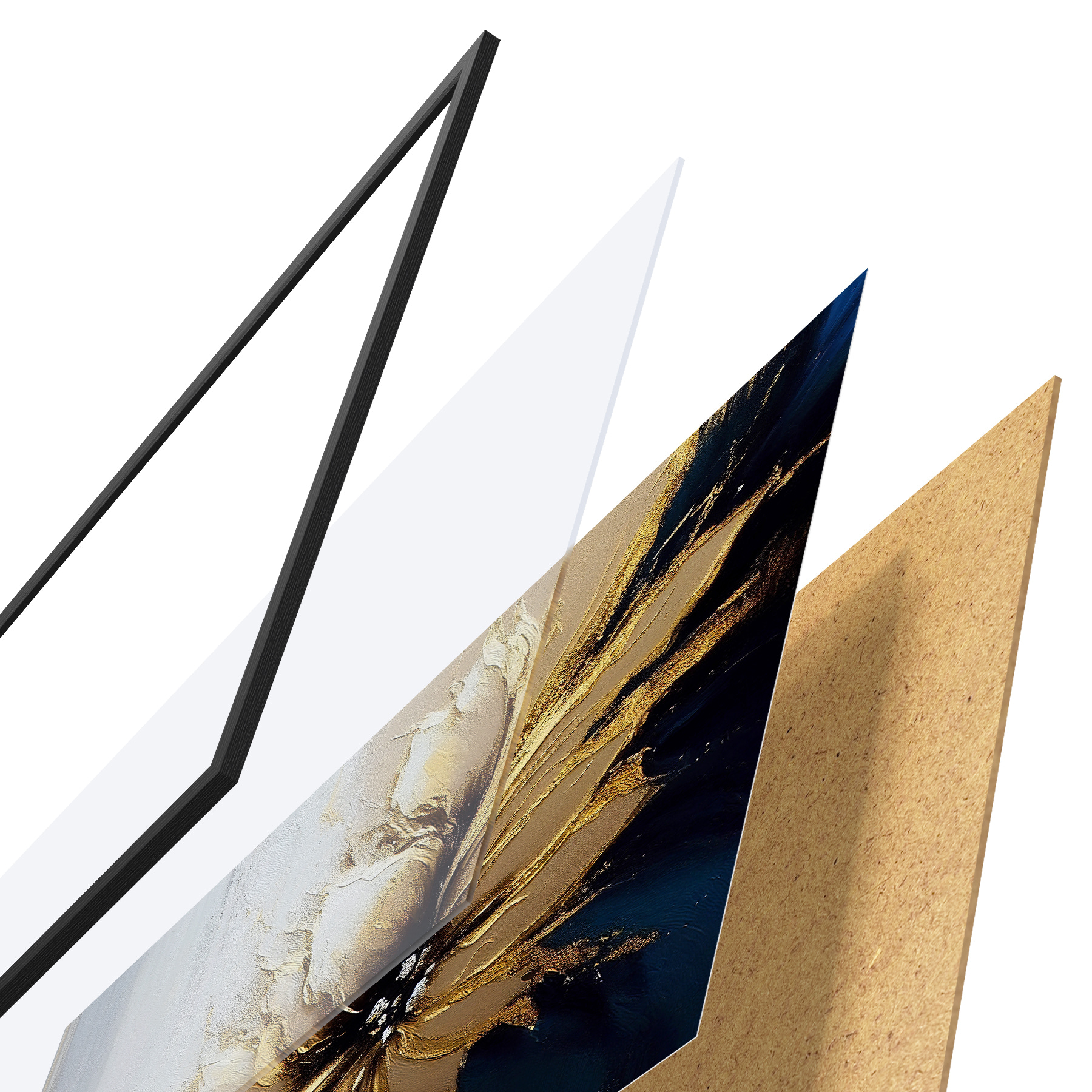 Das Poster besteht aus einem Rahmen, Plexiglas, einem gedruckten Bild und einer Rückwand aus Spanplatten. Dank der Halterungen auf der Rückseite kann das Poster sofort an die Wand gehängt werden.