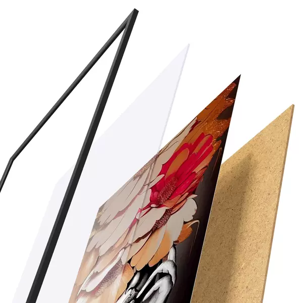 Das Poster besteht aus einem Rahmen, Plexiglas, einem gedruckten Bild und einer Rückwand aus Spanplatten. Dank der Halterungen auf der Rückseite kann das Poster sofort an die Wand gehängt werden.