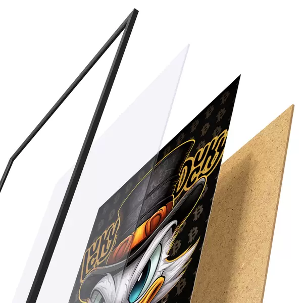 Das Poster besteht aus einem Rahmen, Plexiglas, einem gedruckten Bild und einer Rückwand aus Spanplatten. Dank der Halterungen auf der Rückseite kann das Poster sofort an die Wand gehängt werden.
