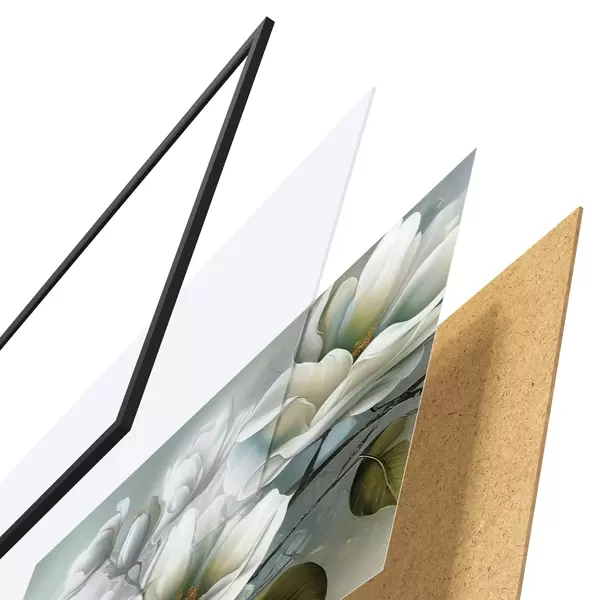 Das Poster besteht aus einem Rahmen, Plexiglas, einem gedruckten Bild und einer Rückwand aus Spanplatten. Dank der Halterungen auf der Rückseite kann das Poster sofort an die Wand gehängt werden.