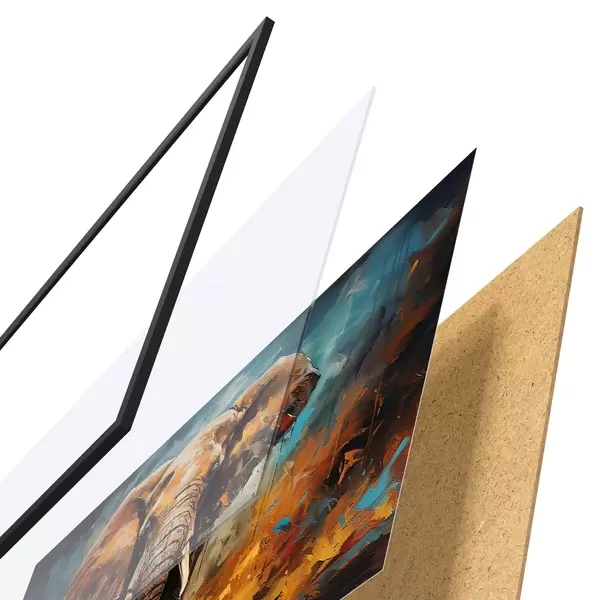 Das Poster besteht aus einem Rahmen, Plexiglas, einem gedruckten Bild und einer Rückwand aus Spanplatten. Dank der Halterungen auf der Rückseite kann das Poster sofort an die Wand gehängt werden.