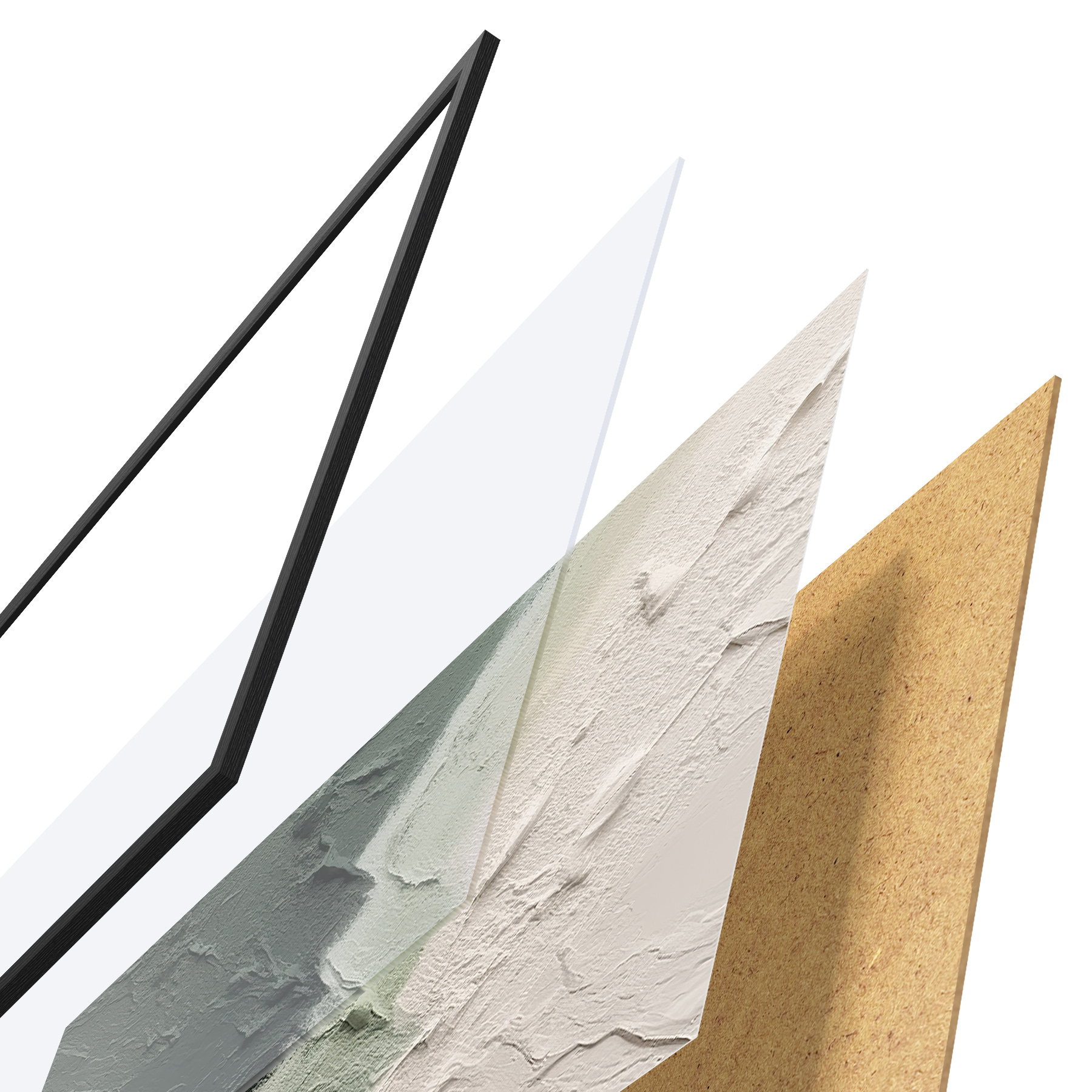 Das Poster besteht aus einem Rahmen, Plexiglas, einem gedruckten Bild und einer Rückwand aus Spanplatten. Dank der Halterungen auf der Rückseite kann das Poster sofort an die Wand gehängt werden.