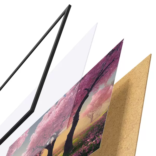 Das Poster besteht aus einem Rahmen, Plexiglas, einem gedruckten Bild und einer Rückwand aus Spanplatten. Dank der Halterungen auf der Rückseite kann das Poster sofort an die Wand gehängt werden.